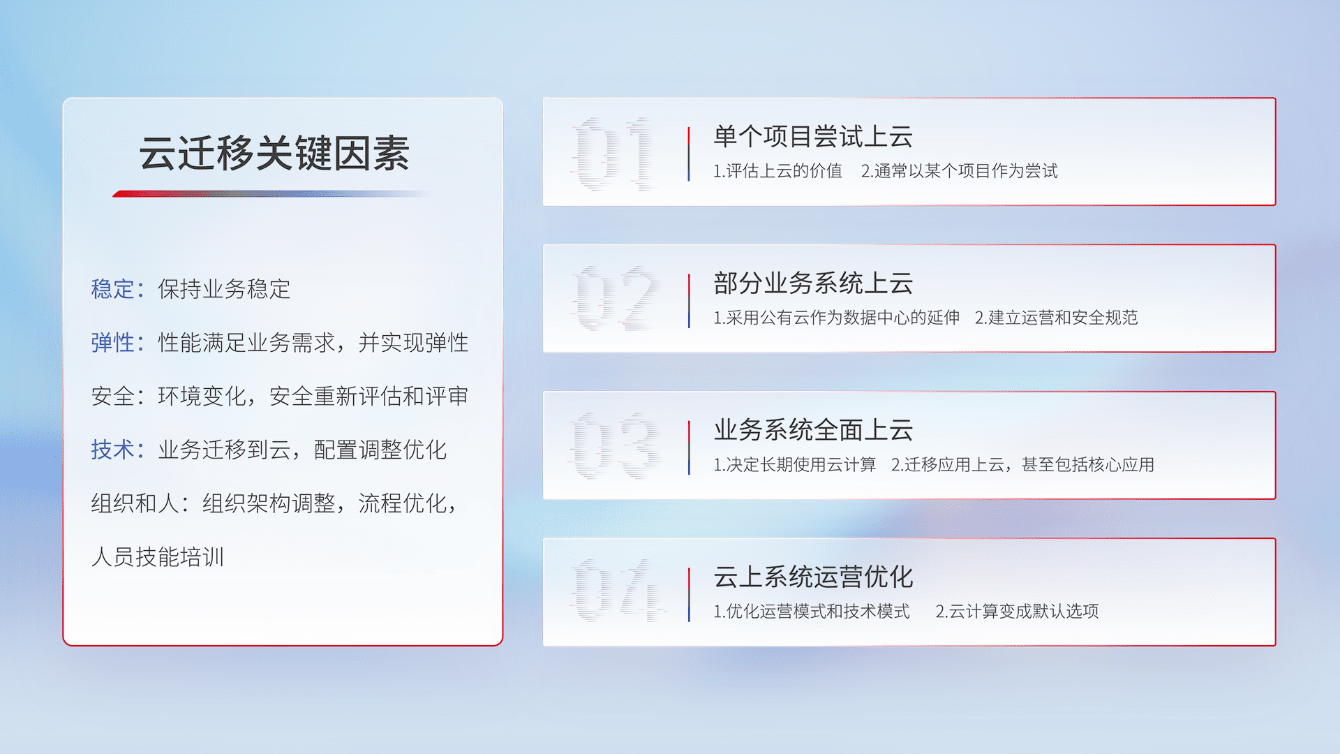 结合实际业务,,从规划设计、、、、云平台选型、、、云原生改造、、、、数据迁移、、、、集成交付,,,,迁移全过程为客户识别最佳上云路径,,,做好风险识别管理,,设计网络架构、、、、身份权限、、、安全审计合规、、、操作审计、、、日志审计、、、、监控告警策略、、、、多站点容灾设计等,,,对云上基础设施进行整体规划,,,提升IT治理水平,,,,以满足弹性、、高可用、、、高性能的需求。。