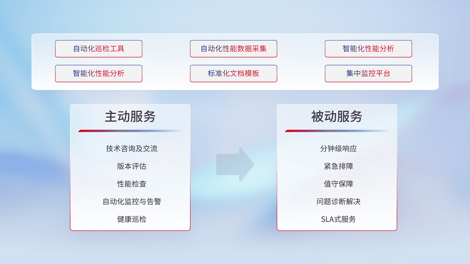 智能化工具和标准化文档,,保障服务质量,,,,提供主动服务(包含技术咨询、、版本评估、、、、性能检查、、、自动化监控与告警、、、、健康巡检)和被动服务包含(分钟级响应、、、紧急排障、、值守保障、、、问题诊断解决、、、、SLA服务)。。