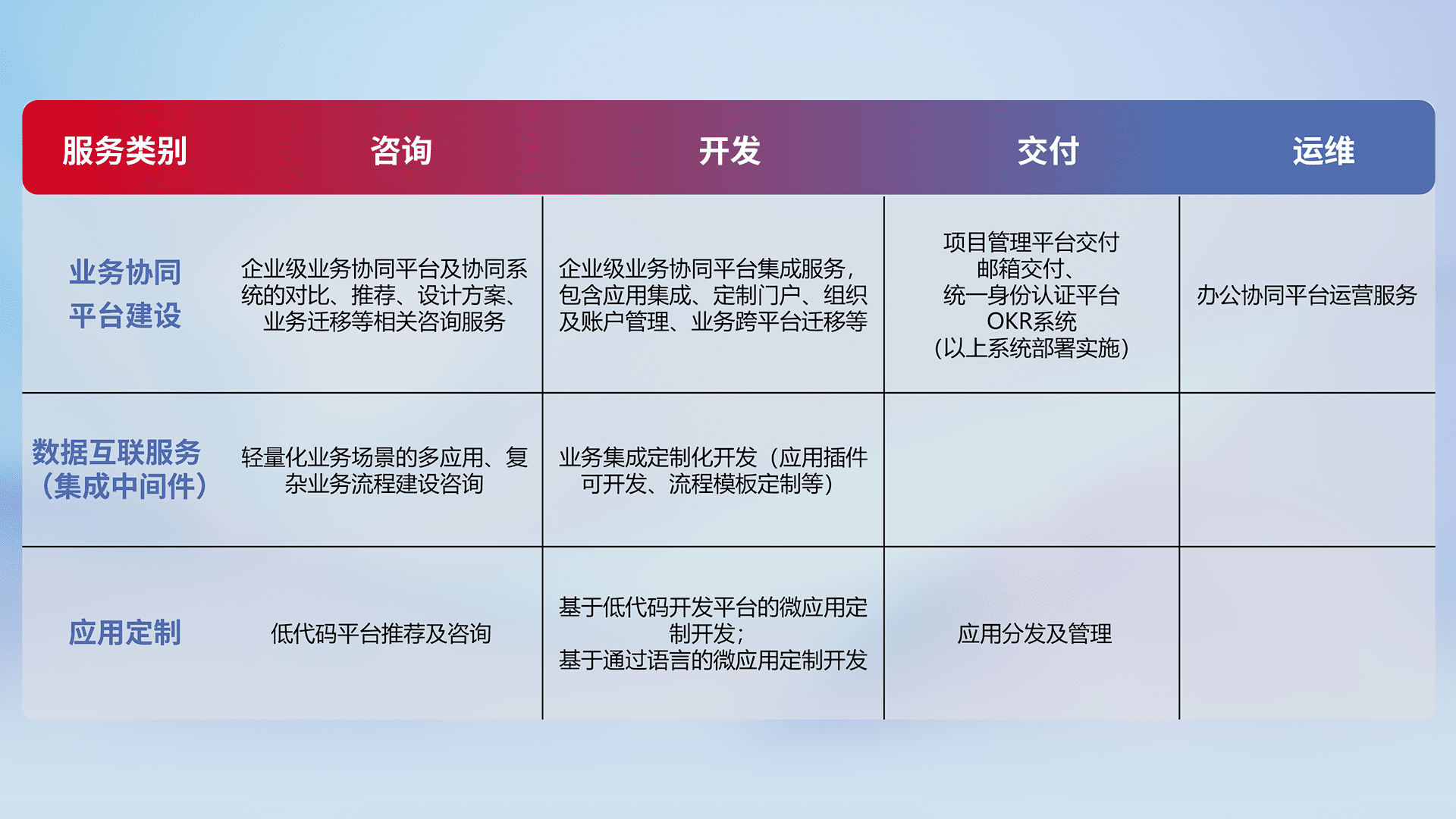 针对钉钉、、、、企微、、、IDaas等平台级产品提供产品的规划、、方案、、交付、、、定制化开发等服务,,,实现如统一协同办公、、、智能客户服务、、混合会议管理、、智能数据查询、、等业务场景,,,,实现数字化转型。。。。