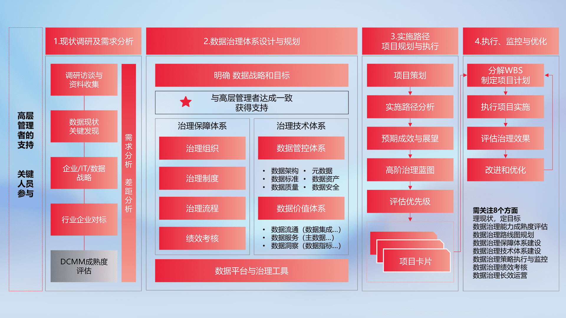 制定并执行统一的数据标准,,,,规范数据定义和格式,,消除冗余和不一致性,,,实现跨部门和跨系统的数据一致性,,,为企业提供标准化的数据基础。。